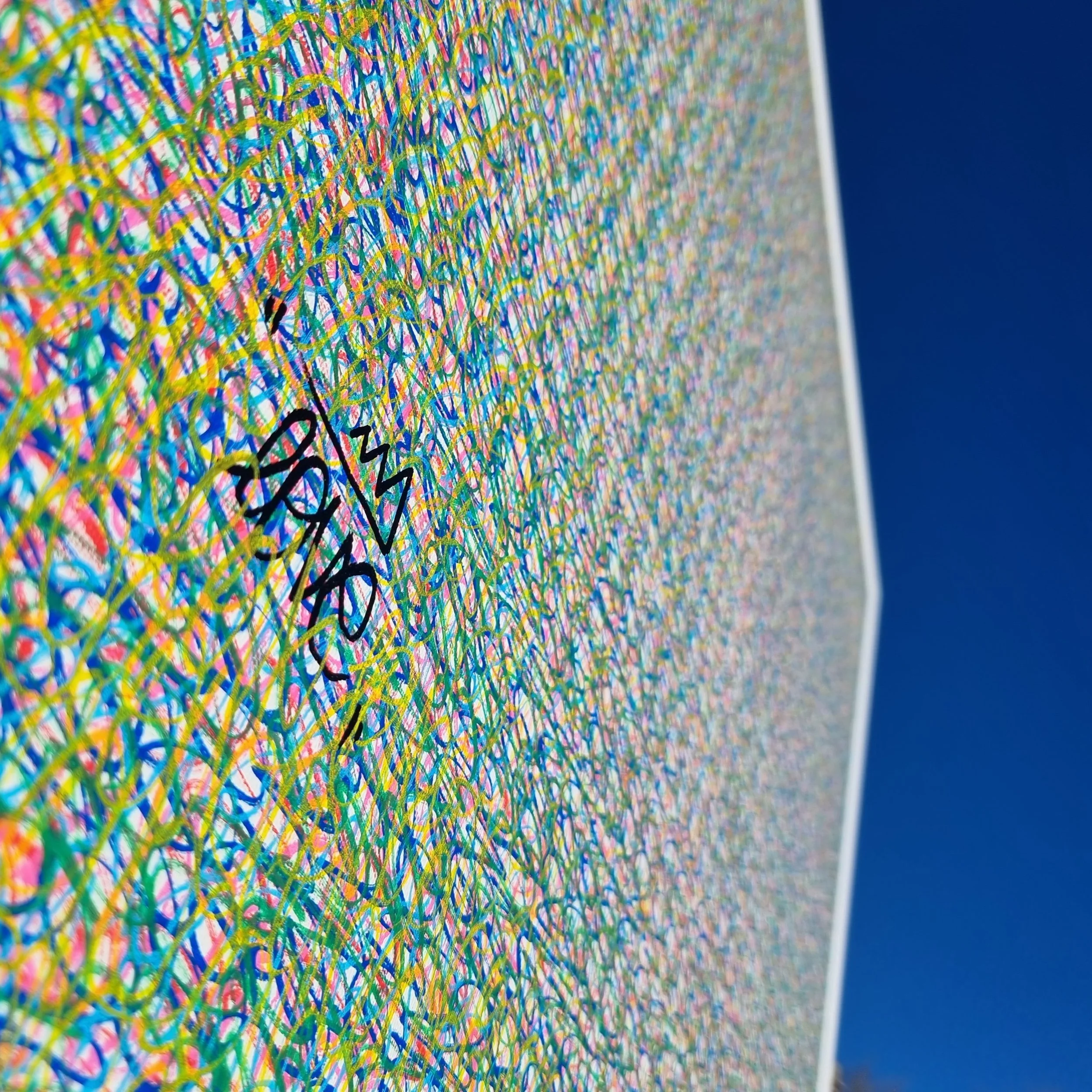 Dans la Blast Series, le langage est abandonné. Chaque œuvre commence par un cercle placé au centre — noyau structural simple à partir duquel des gestes explosifs, des éclaboussures et des lignes en orbite se déploient vers l'extérieur. Le point de départ est fixe. Ce qui en émerge ne l'est jamais.
